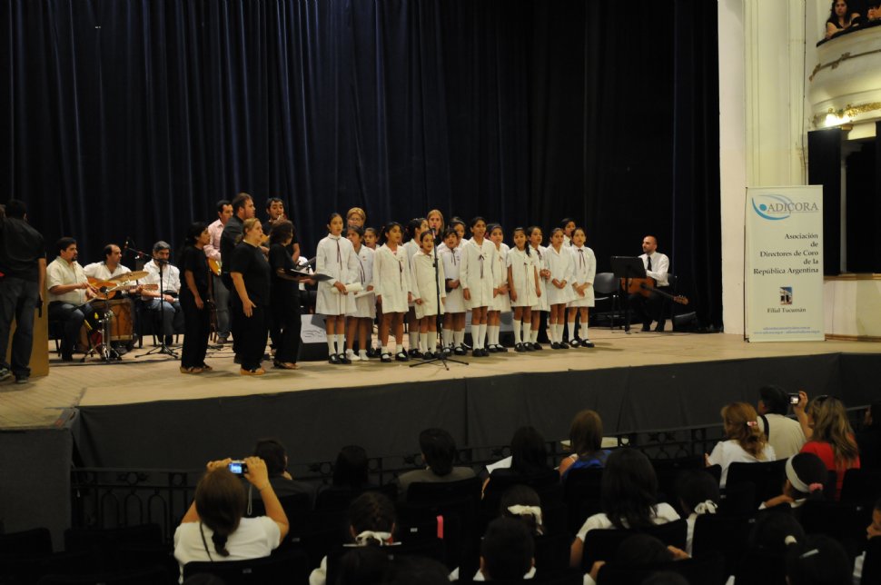 Sobre el escenario, y por primera vez, unos 700 alumnos de escuelas primarias de toda la provincia entonaron una variedad de 10 canciones, en el marco del proyecto "En cada escuela un coro". El encuentro de voces se realizó en el Teatro San Martín, el jueves, en el marco de la finalización de las clases, y duró una hora. Simultáneamente en todos los establecimientos, y en turno mañana, alrededor de las 9.30, los estudiantes salieron al patio y entonaron las canciones aprendidas durante el ciclo 2011.