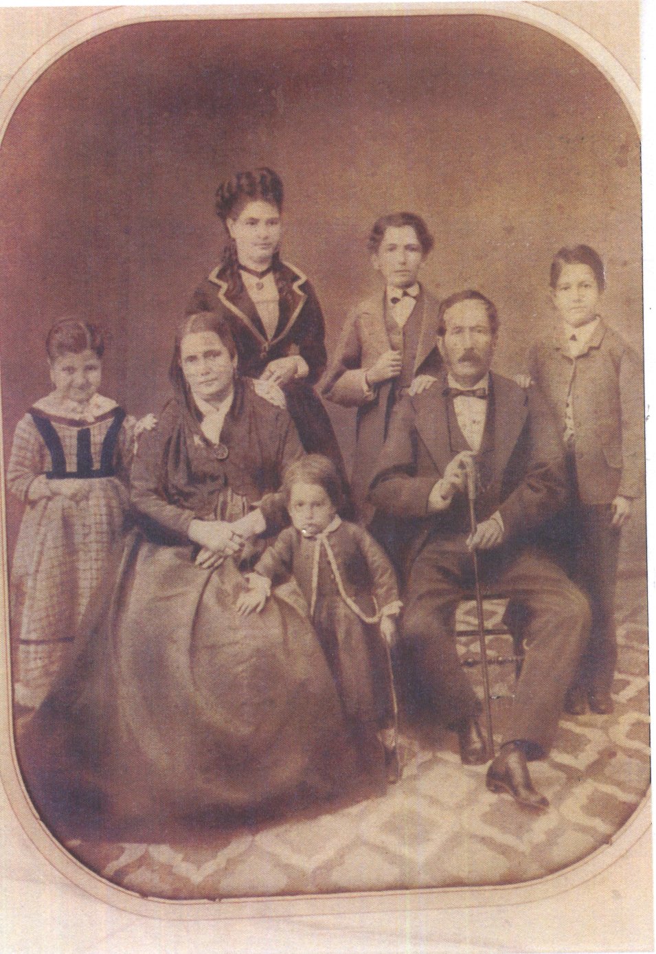 LOS ROMERO. En 1870 aparecen, sentados Ambrosio Romero y Serafina López. Desde la izquierda, de pie, sus hijos Serafina (luego de Nougués), Carmen, Miguel y Ambrosio. Con la madre está José, que murió en la infancia. LA GACETA / ARCHIVO