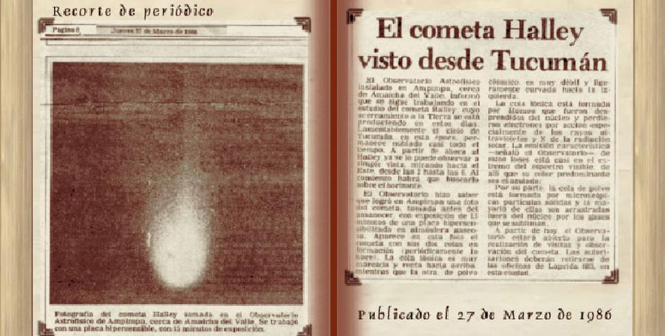 "El cometa Halley visto desde Tucumán". Así se tituló en las páginas de LA GACETA un artículo que daba cuenta del paso del famoso astro. Y la imagen que ilustra la información fue obtenida por el Observatorio Astronómico de Ampimpa, que registró una de las primeras fotografías tomadas desde Argentina, el 17 de noviembre de 1985.