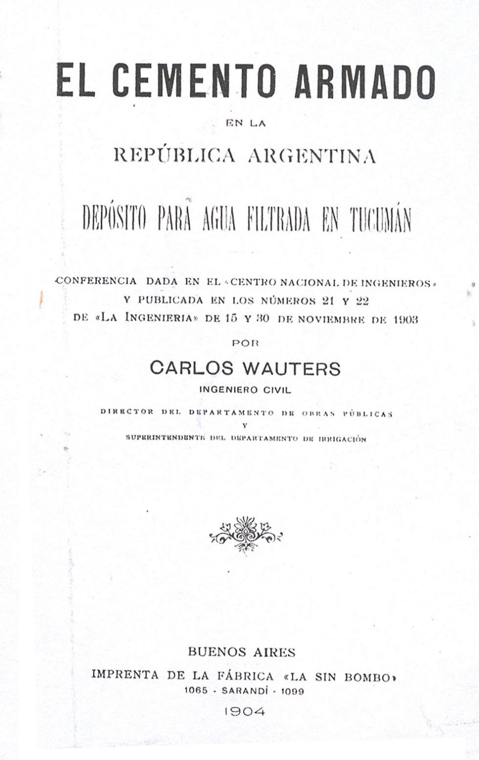 Nos interesa rescatar un pequeño libro (56 páginas con fotografías y planos desplegables) que Wauters editó en 1904. Se titulaba "El cemento armado en la República Argentina. Depósito para agua filtrada en Tucumán". El trabajo exaltaba de entrada las ventajas del cemento armado que, si se difundía desde tiempo atrás en Europa y Estados Unidos, recién comenzaba a emplearse en la Argentina.