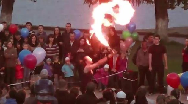 La joven artista, de 16 años, fue identificada como Paulina Druzhinin. En el video, compartido en el portal YouTube, se puede ver cómo maniobra con dos varas encendidas y deleita al público con su habilidad. El problema se presentó cuando quiso soplar el fuego de una de sus herramientas, ya que un poco de la sustancia usada para este efecto quedó impregnada a su boca. Al hacerlo, una llama se encendió en el rostro de la adolescente, que corrió desesperada por la situación.