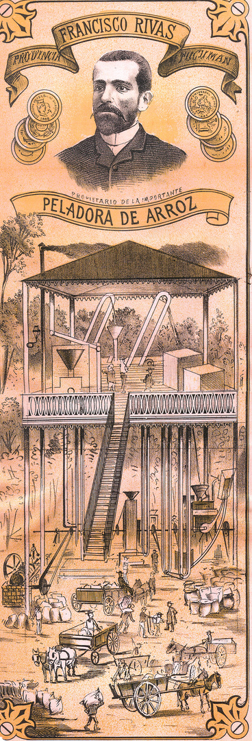 UN ESTABLECIMIENTO DE 1892. "La Estadística Gráfica" de ese año, publicaba el dibujo de una peladora de arroz tucumana, propiedad de Francisco Rivas. LA GACETA / ARCHIVO