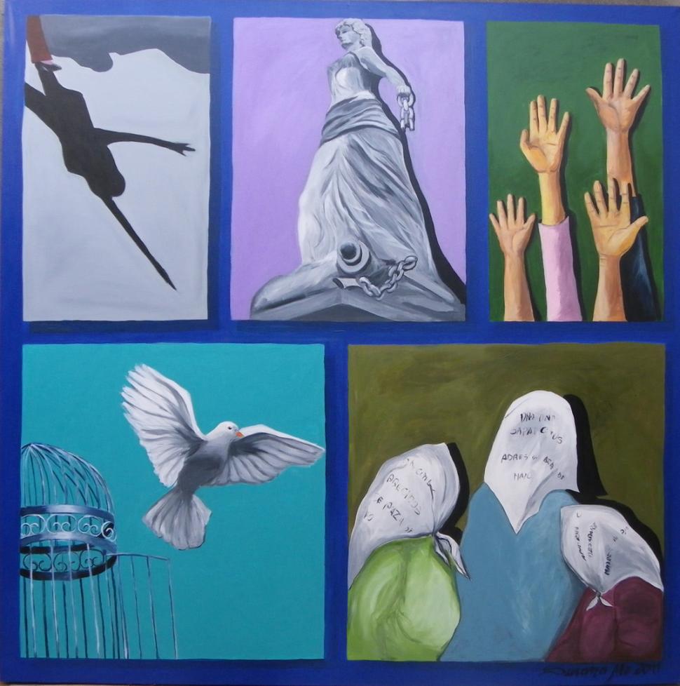 Por el contrario, en la pintura de Susana Ale la imagen de la paloma y del monumento de la Libertad, así como los pañuelos de las Madres y sus inscripciones, dan cuenta de sus preocupaciones sociales (imagen de arriba). Es en estas creaciones en las que queda netamente plasmada su mirada política.