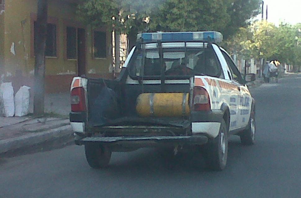 "Foto tomada desde mi coche en Crisóstomo y Colón, por avenida Colón. Se observa una camioneta de Policía Vial sin patente y claramente en mal estado. Mi pregunta es