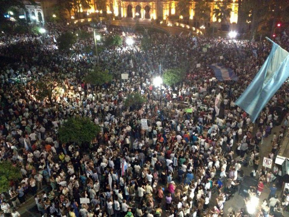 Una multitud se instaló anoche en la Plaza Independencia para manifestarse contra el Gobierno nacional a través de un cacerolazo denominado 8N. De acuerdo a la Policía de Tucumán, alrededor de 10.000 personas participaron de la protesta. La concentración comenzó a tomar forma después de las 20, horario fijado para la protesta a través de las redes sociales. "No a la corrupción", "Basta de inseguridad" y "No a la re-reelección", fueron algunas de las consignas que se escucharon entre cánticos, cucharas, cacerolas, banderas y carteles. Quienes respondieron a la convocatoria, en gran medida jóvenes y mujeres, dieron varias vuelta a la plaza Independencia. Además, entonaron en reiteradas ocasiones las estrofas del Himno Nacional Argentino. Debido a la concurrencia, los manifestantes se apostaron sobre las escalinatas de la iglesia San Francisco y ocuparon también parte de la calzada de la segunda cuadra de 25 de Mayo. Aquí, lo que reflejaron los tuiteros de todo el país. LA GACETA ©