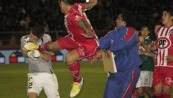 ATAQUE. Este es el momento justo del salto y posterior patada del rionegrino al arquero Viana. FOTO TOMADA DE 24HORAS.CL
