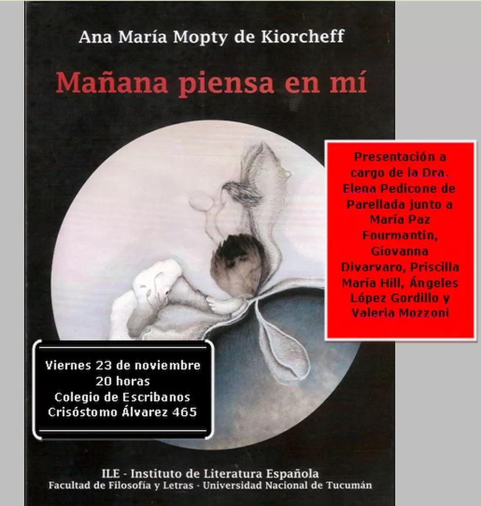 "Mañana piensa en mí" se titula el libro de microrrelatos de Ana María Mopty de Kiorcheff, que se presentará hoy a las 20 en el Colegio de Escribanos (Crisóstomo Alvarez 465). La presentación estará a cargo de los integrantes del Instituto de Literatura Española (ILE) de la Facultad de Filosofía y Letras de la UNT, que preside Elena Pedicone de Parellada. El encuentro cuenta con el auspicio del centro cultural Rougés.