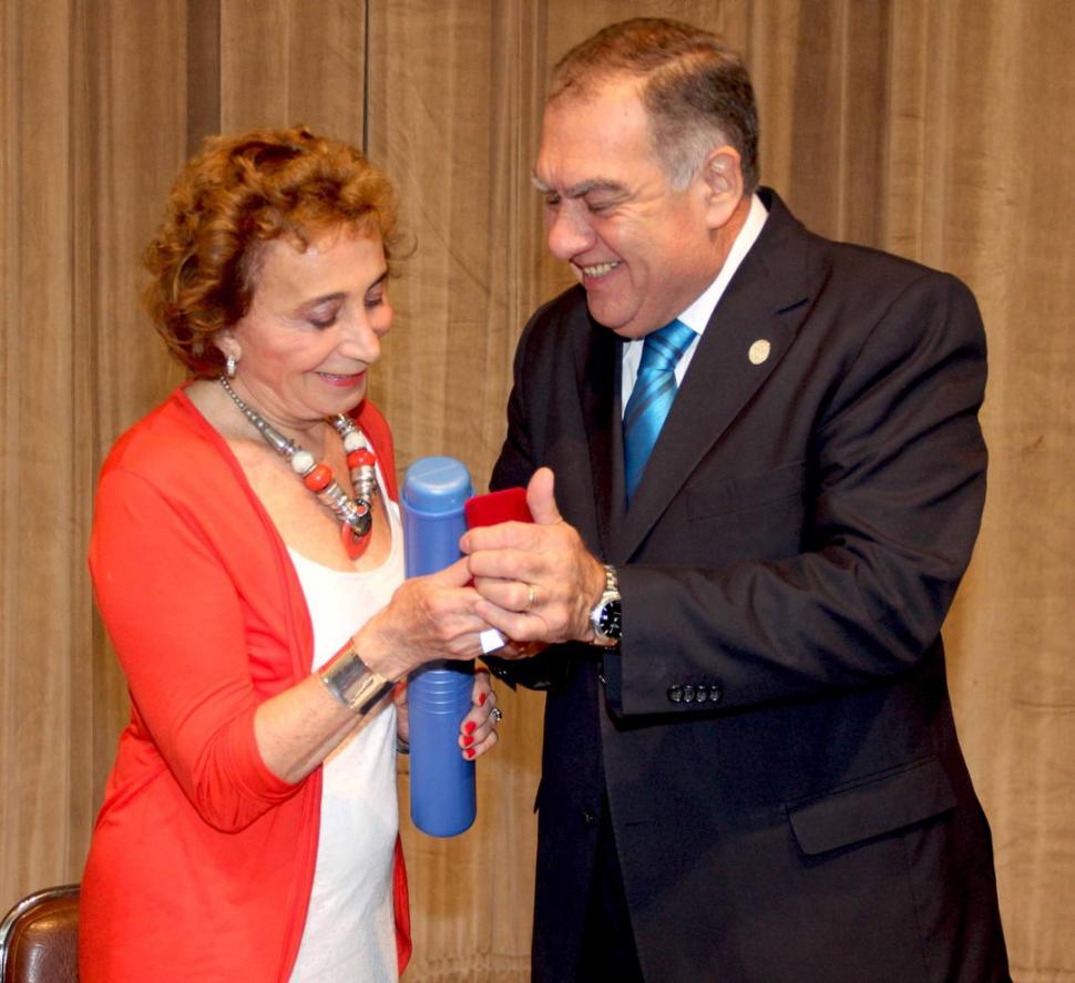 La doctora en Filosofía Cristina Bulacio recibe de manos del rector de la UNT, Juan Cerisola, el título de Profesora Consulta, durante un acto realizado en el Centro Virla. Se reconoció a la doctora por su vasta trayectoria y por haber defendido siempre desde sus cátedras la causa de la verdad y la justicia.