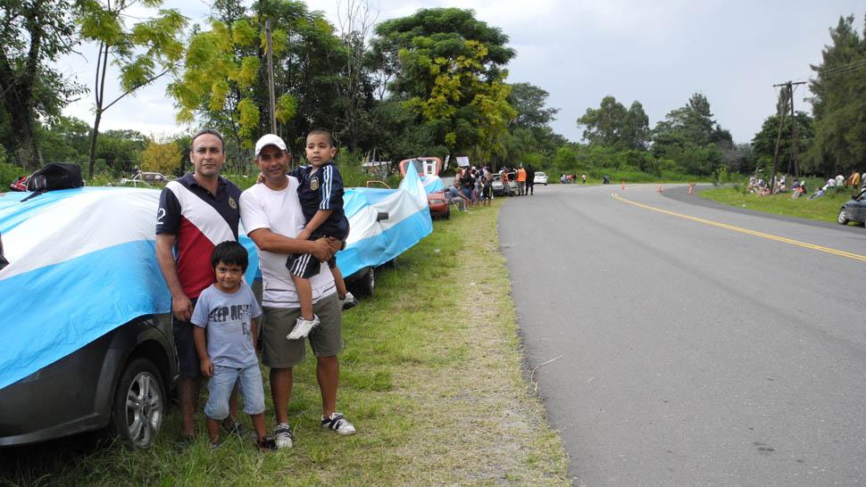 Omar Correa (izquierda) extendió sobre tres vehículos una bandera argentina de 25 metros. Llegó con su familia desde Monteros alrededor del mediodía y se instaló en el cruce de Las Mesadas. El intenso calor no le impidió emocionarse el sábado por el paso del Dakar.