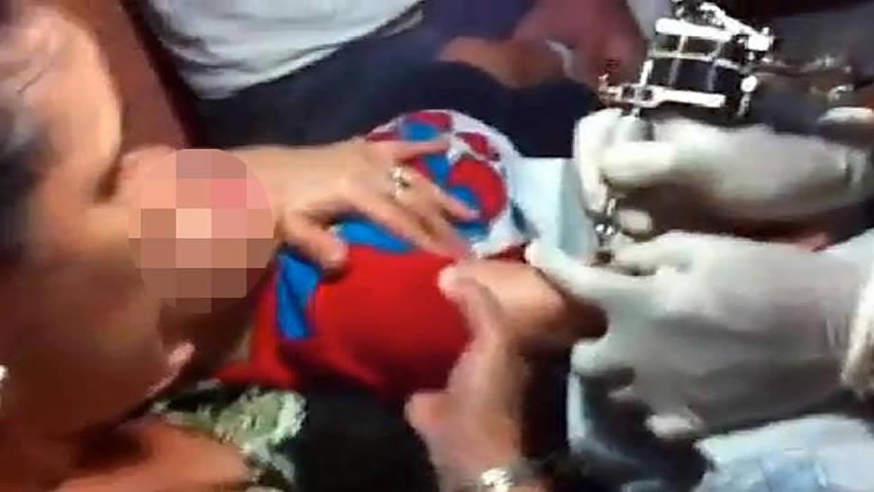 Insistentes, tres adultos someten al niño para que no se escape de su asiento, mientras el tatuador les indica que por favor lo hagan con más fuerza.