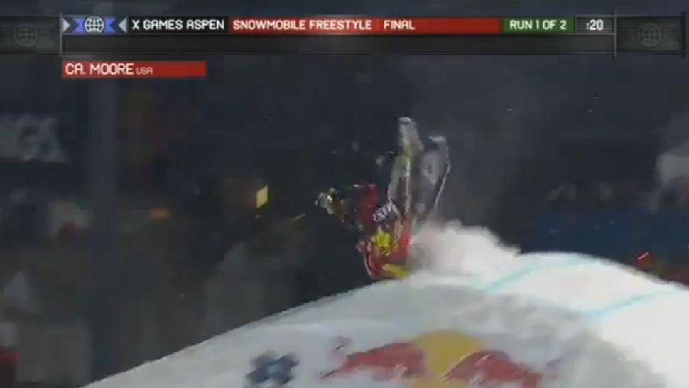Moore intentó una voltereta invertida el 24 de enero cuando los esquís de su vehículo chocaron con la parte más alta de la rampa de aterrizaje, y salió volando por encima del manubrio. Moore cayó de cabeza en la nieve, y la moto le pasó por encima, informa el sitio deportivo.