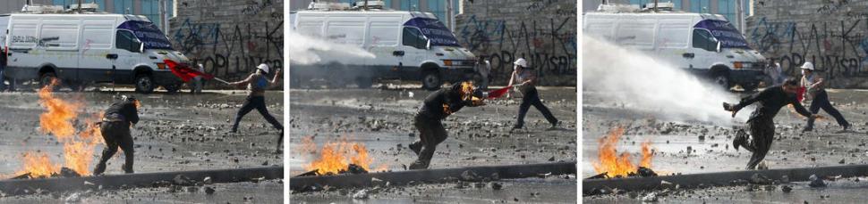 La policía antidisturbios de Turquía se volvió a enfrentar a miles de manifestantes en la Plaza Taksim de Estambul. La protesta desafió la petición del primer ministro Tayyip Erdogan para que despejen la zona y pongan fin a 10 días de protestas. La Policía disparó gases lacrimógenos contra la multitud. Entre la movilización había personas vestidas con trajes de oficina junto a jóvenes enmascarados que habían protagonizado escaramuzas durante todo el día de ayer. Tras la represión, se dispersaron por calles laterales y hoteles cercanos. Cañones de agua barrieron la plaza. En las refriegas, uno de los manifestantes se prendió fuego al tratar de lanzar una bomba molotov contra la Policía, que le arrojó un chorro de agua para salvarlo de las quemaduras.