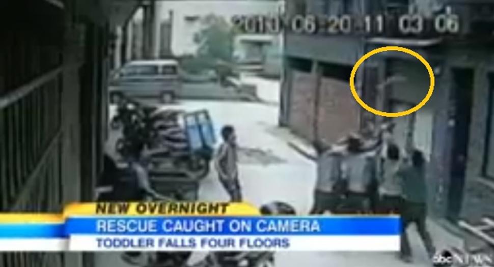 CAIDA LIBRE. La nena cayó cinco pisos y tuvo un leve impacto contra el suelo gracias a los rescatistas. CAPTURA DE VIDEO
