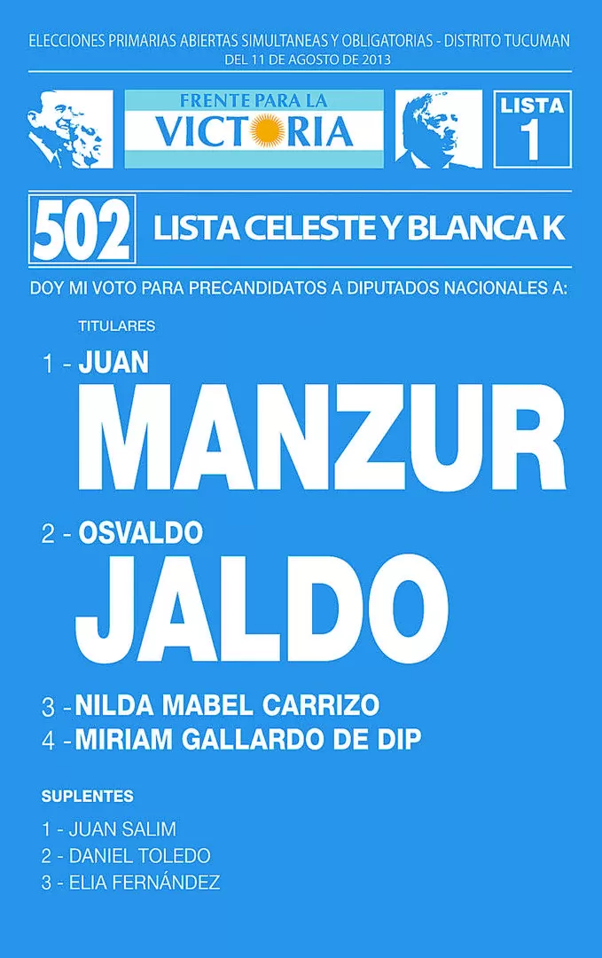 Entre los cuestionados estuvieron los modelos de "Celeste y Blanca K" (Juan Manzur) y "Amarillo-MUP" (Luis Romano), ambos del Frente para la Victoria. Estas nóminas habían colocado, sin hacer reserva, una imagen de Kirchner en la boleta. Pese a las observaciones, el juez Bejas autorizó luego este diseño. Entre los argumentos, explicó que se trataba "del fundador del movimiento".