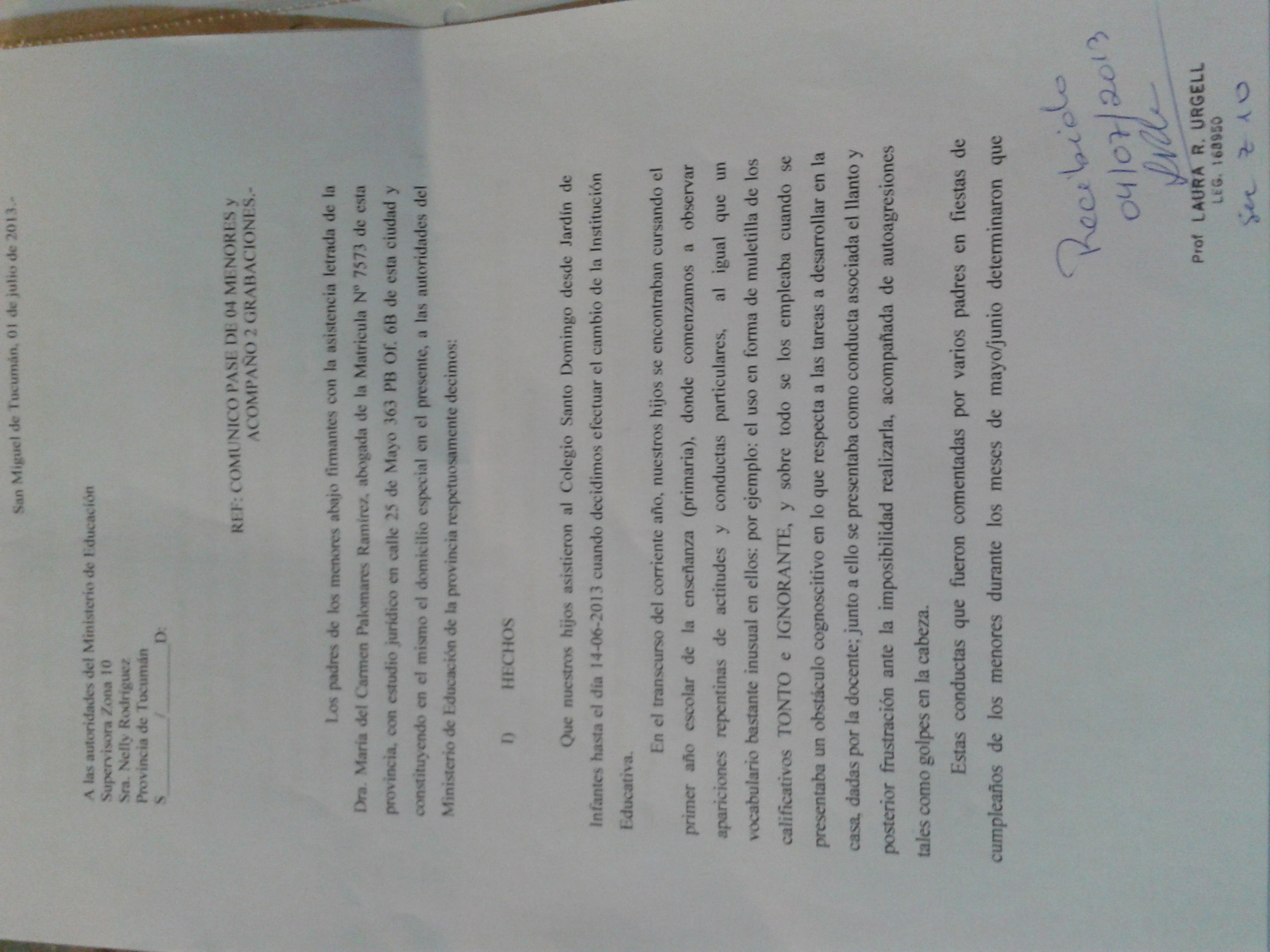"Cuando se enteraron de todo, el pase nos lo otorgaron una semana después, pero la fecha que consta en este corresponde al día 18 de Junio. Días posteriores la abogada presentó un escrito en donde constaban los motivos por los que solicitábamos el cambio, y el maltrato de esta docente hacia los chicos. Además, adjunto a ésta se archivó el audio.
