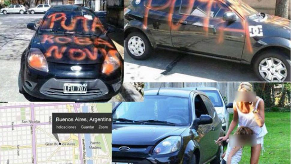 En la imagen se ve el vehículo estacionado en alguna calle de un barrio porteño y en él puede leerse la frase “Puta roba novio”. Lo que remite a una posible venganza por parte de una mujer despechada.