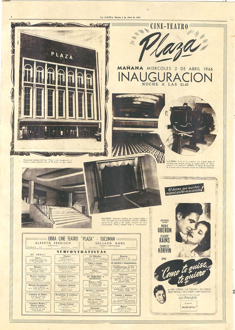 El Plaza se inauguró el miércoles 3 de abril de 1946 con las películas “Como te quise te quiero” y “Espíritu triunfador”.