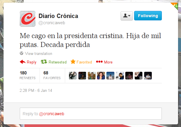 BUENOS AIRES.- Una sorpresiva publicación criticando e insultando a la presidenta, Cristina Fernández de Kirchner, apareció esta tarde en la cuenta oficial que tiene Crónica en Twitter. Obviamente, con los más de 200 mil seguidores que cuenta el diario en la red social, el mensaje no tardó en expandirse.
