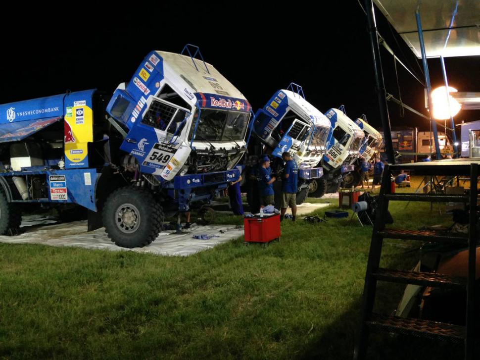 Cerca del tráiler de Himoinsa, están los rusos de Kamaz, los reyes de los camiones. A destajo, decenas de rubios hacen los arreglos necesarios. Atrás, y pegados a un motor en funcionamiento, dos de ellos descansan sentados sobre el pasto. Cerveza y pucho en mano, algo normal en el “turno noche” del Dakar. “¿Y cuándo descansan ustedes?”, le preguntamos a uno de los mecánicos. “Luego”, alcanza a decir algo serio. El sueño en estos casos parece ser materia de una carrera de postas: a todos les llega. Después de todo, a nadie deben faltarle energías.