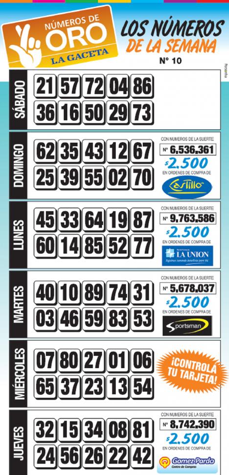 Este miércoles se publicó la grilla completa de los Números de Oro de LA GACETA para que los lectores puedan chequear sus tarjetas, ya que mañana el diario no se editará en su soporte papel. Les recordamos que el pozo es de $ 70.000 y que, como todas las semanas, aquellos lectores que completen los 15 números de una de las grillas de su tarjeta de Números de Oro deben presentarse por calle Mendoza 654 hasta mañana jueves a las 18, que cierra la semana número 10 de Números de Oro. En caso de que la tarjeta ganadora tenga la leyenda Usuario Tarjeta Sol, duplica el premio.