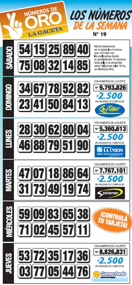 Como todos los jueves, se publicó la grilla completa de los Números de Oro de LA GACETA para que los lectores puedan chequear sus tarjetas. Aquellos lectores que completen los 15 números de una de las grillas de su tarjeta de Números de Oro deberán presentarse por calle Mendoza 654 hasta las 18, que cierra la semana número 19 de Números de Oro. En caso de que la tarjeta ganadora tenga la leyenda Usuario Tarjeta Sol, duplica el premio.