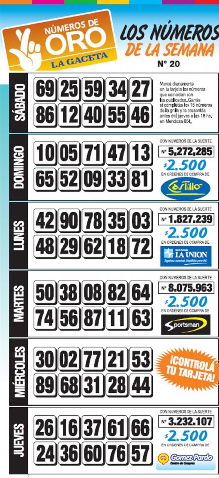 Como todos los jueves, se publicó la grilla completa de los Números de Oro de LA GACETA para que los lectores puedan chequear sus tarjetas. Aquellos lectores que completen los 15 números de una de las grillas de su tarjeta de Números de Oro deberán presentarse por calle Mendoza 654 hasta las 18, que cierra la semana número 20 de Números de Oro. En caso de que la tarjeta ganadora tenga la leyenda Usuario Tarjeta Sol, duplica el premio.