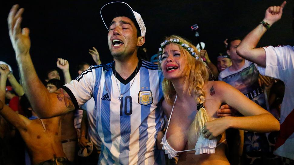 HASTA LAS LÁGRIMAS. Una pareja de argentinos llora en el Fan Fest de Río de Janeiro por la clasificación. REUTERS