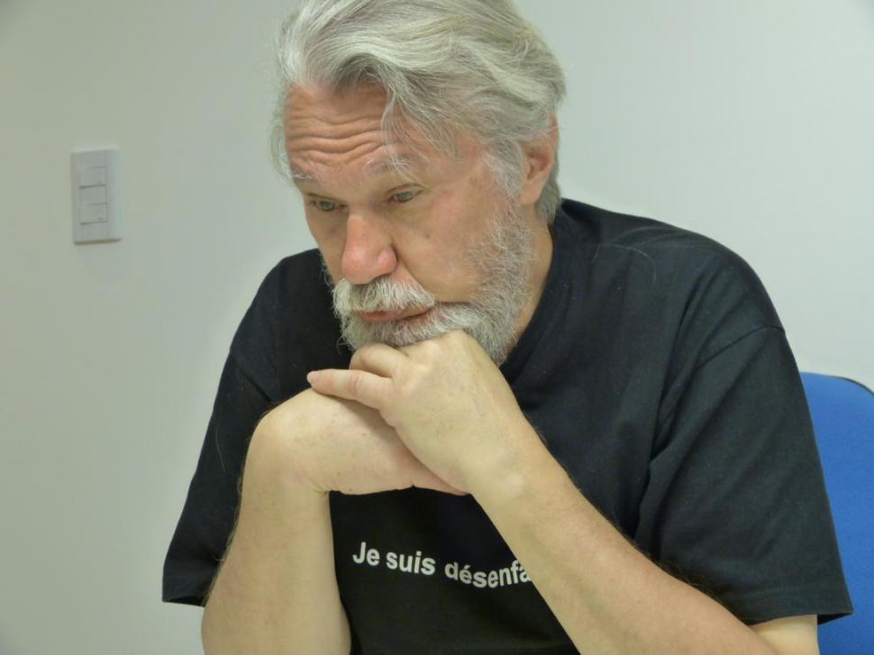 Vestido al igual que durante los casi dos meses que duró el juicio, Bouvier llegó a las oficinas de LA GACETA SALTA con su campera roja y azul. Debajo, la remera negra con la leyenda “Je suis désénfanté”, algo así como “estoy des-hijado”.