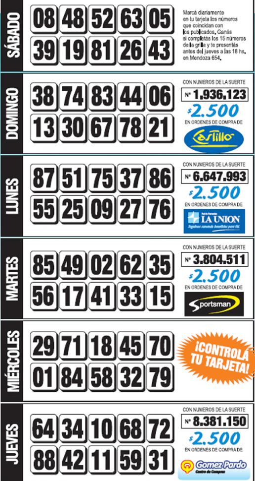 Como todos los jueves, se publicó la grilla completa de los Números de Oro de LA GACETA para que los lectores puedan chequear sus tarjetas. Aquellos lectores que completen los 15 números de una de las grillas de su tarjeta de Números de Oro deberán presentarse por calle Mendoza 654 hasta las 18, que cierra la semana número 23 de Números de Oro. En caso de que la tarjeta ganadora tenga la leyenda Usuario Tarjeta Sol, duplica el premio.