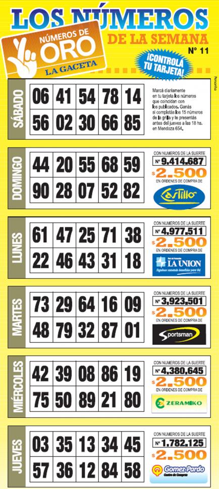 Como cada jueves, se publicó la grilla completa de los Números de Oro de LA GACETA para que los lectores puedan revisar sus tarjetas. Aquellos que completen los 15 números de una de las grillas de su cartón de Números de Oro deberán presentarse en calle Mendoza 654 hasta las 18, que cierra la semana número 8 de Números de Oro. En caso de que la tarjeta ganadora tenga la leyenda Usuario Tarjeta Sol, duplica el premio.