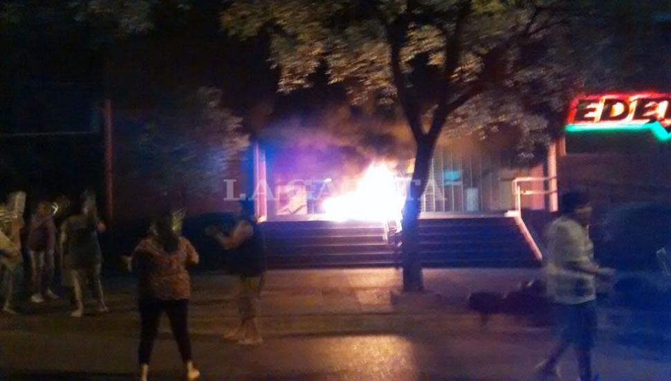 Con el paso del tiempo y debido a que su reclamo no era atendido, un grupo de los manifestantes quemó gomas a centímetros de las puertas de vidrio de la firma, por lo que a los pocos minutos llegó al lugar una comisión de agentes de la comisaría 1° y de la División Bomberos de la Policía.