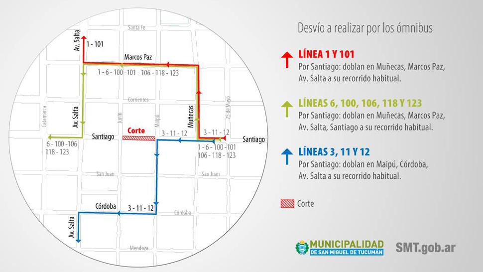 - Líneas 1 y 101, por Santiago, tomarán Muñecas, Marcos Paz, y Av. Salta, a su camino habitual.