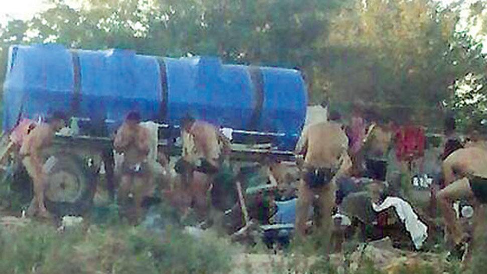 PÉSIMAS CONDICIONES. Los cosecheros tienen que asearse con tachos de agua, en medio del campo. FOTOS DE ELLIBERAL.COM.AR