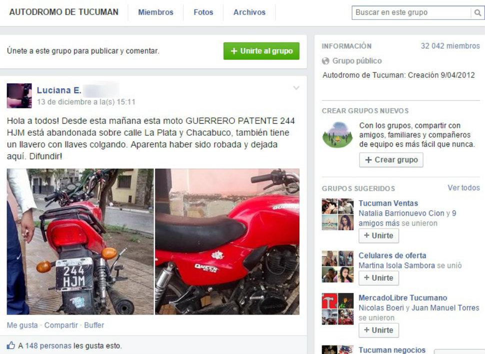 DENUNCIA. Los datos de la moto fueron publicados en el grupo de Facebook. CAPTURA DE PANTALLA