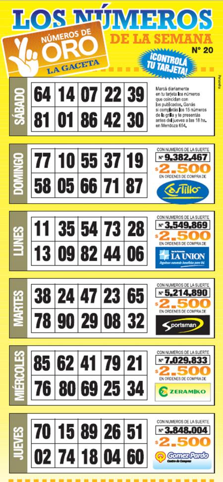 Como cada jueves, se publicó la grilla completa de los Números de Oro de LA GACETA para que los lectores puedan revisar sus tarjetas. Aquellos que completen los 15 números de una de las grillas de su cartón de Números de Oro deberán presentarse en calle Mendoza 654 hasta las 18, que cierra la semana número 20 de Números de Oro. En caso de que la tarjeta ganadora tenga la leyenda Usuario Tarjeta Sol, duplica el premio.