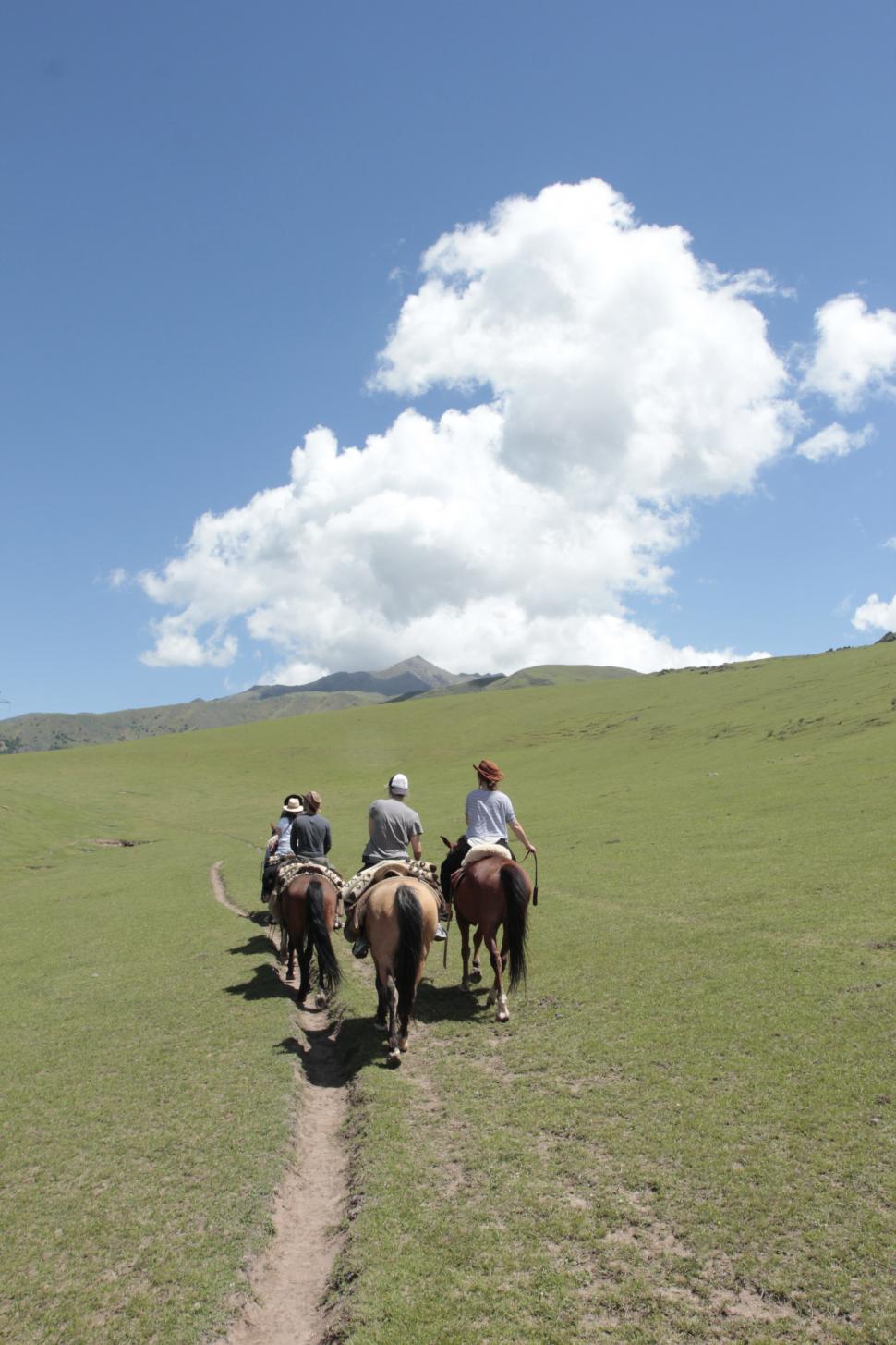 Y cuando el cuerpo se ha acostumbrado al vaivén de las cuatro patas y la vista se encuentra a gusto con los bloques de nubes poderosas que circulan en las alturas, el camino se abre y aparecen Las Mesadas, con su verde de Wimbledon y sus resabios de corrales indígenas. El sol potencia la extensión de una planicie sin árboles que recibe gustosa a la hacienda nómade. Las vistas exponen 360º de naturaleza conmovedora sólo perturbados por la presencia -inocultable- de las torres de alta tensión colocadas a finales del milenio pasado.