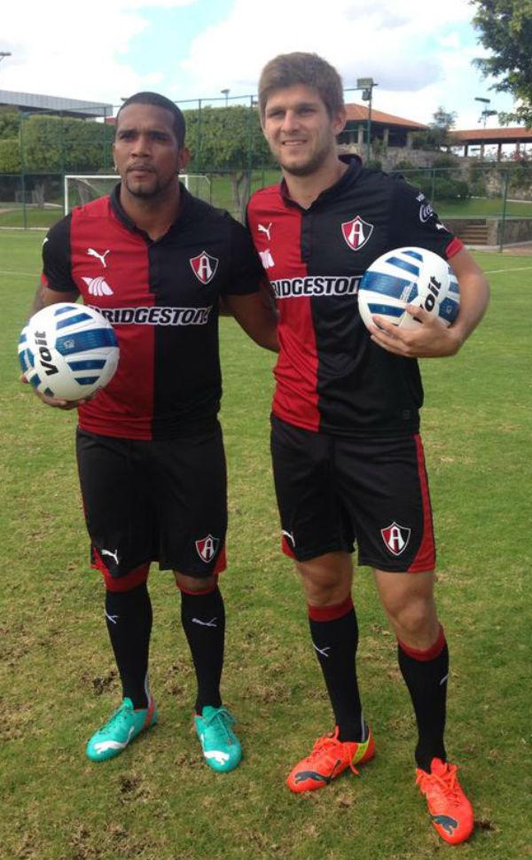 FELICEZ. Kannemann (derecha) y el delantero ecuatoriano Christian Suárez posan con su nueva indumentaria. FOTO TOMADA DEL TWITTER DE @ATLASFC
