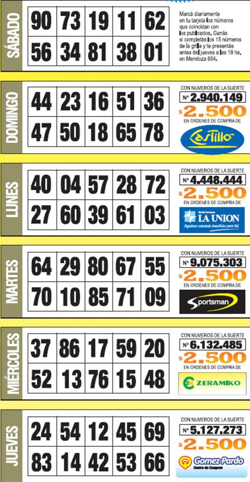 Como cada jueves, se publicó la grilla completa de los Números de Oro de LA GACETA para que los lectores puedan revisar sus tarjetas. Aquellos que completen los 15 números de una de las grillas de su cartón de Números de Oro deberán presentarse en calle Mendoza 654 hasta las 18, que cierra la semana número 23 de Números de Oro. En caso de que la tarjeta ganadora tenga la leyenda Usuario Tarjeta Sol, duplica el premio.