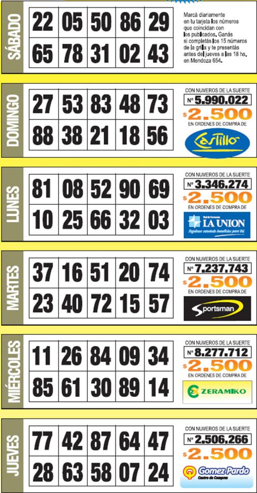 Como cada jueves, se publicó la grilla completa de los Números de Oro de LA GACETA para que los lectores puedan revisar sus tarjetas. Aquellos que completen los 15 números de una de las grillas de su cartón de Números de Oro deberán presentarse en calle Mendoza 654 hasta las 18, que cierra la semana número 30 de Números de Oro. En caso de que el ganador sea usuario Tarjeta Sol, duplica el premio.