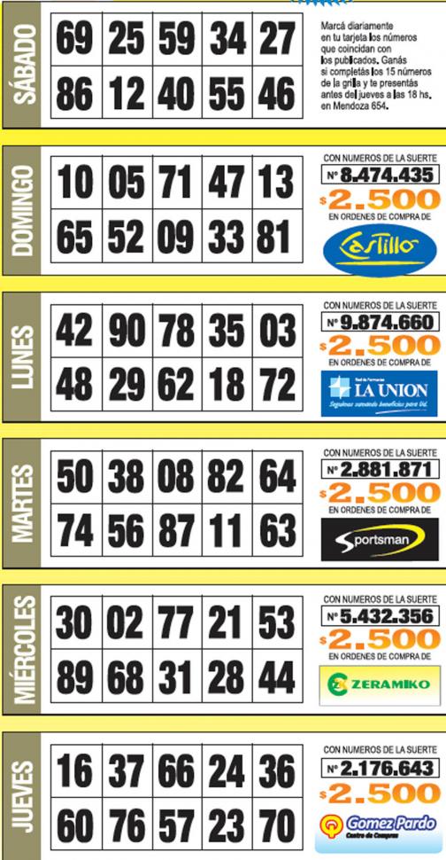 Como cada jueves, se publicó la grilla completa de los Números de Oro de LA GACETA para que los lectores puedan revisar sus tarjetas. Aquellos que completen los 15 números de una de las grillas de su cartón de Números de Oro deberán presentarse en calle Mendoza 654 hasta las 18, que cierra la semana número 32 de Números de Oro. En caso de que el ganador sea usuario Tarjeta Sol, duplica el premio.