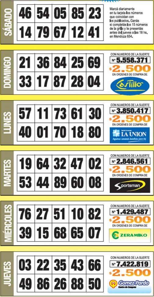 Como cada jueves, se publicó la grilla completa de los Números de Oro de LA GACETA para que los lectores puedan revisar sus tarjetas. Aquellos que completen los 15 números de una de las grillas de su cartón de Números de Oro deberán presentarse en calle Mendoza 654 hasta las 18, que cierra la semana número 33 de Números de Oro. En caso de que el ganador sea usuario Tarjeta Sol, duplica el premio.