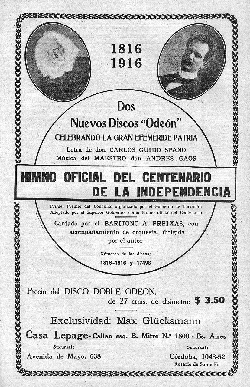 Un aviso en julio de 1916, en la revista porteña “Caras y Caretas”, publicitaba la grabación del Himno en un disco doble del sello “Odeón”. Lo cantaba el barítono A. Freixas, con acompañamiento de orquesta dirigida por el maestro Gaos. Apunta León Benarós que el “Himno del Centenario” es “una de las composiciones patrióticas más olvidadas”.