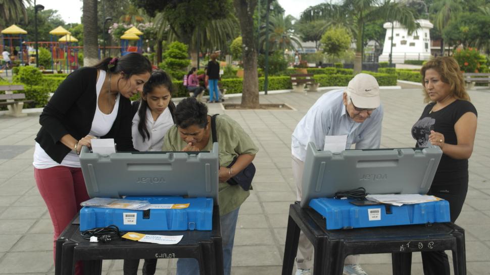 Bajo el tibio sol de la siesta salteña, en la plaza San Martín de Tartagal, don Norberto Castro observa un monitor sobre una mesa. El jubilado de 72 años, alto y de cabello canoso, sigue con atención las explicaciones de Gabriela Talero, una empleada del Poder Judicial provincial que, además, es una de las decenas de capacitadoras trashumantes del sistema digital de sufragio.