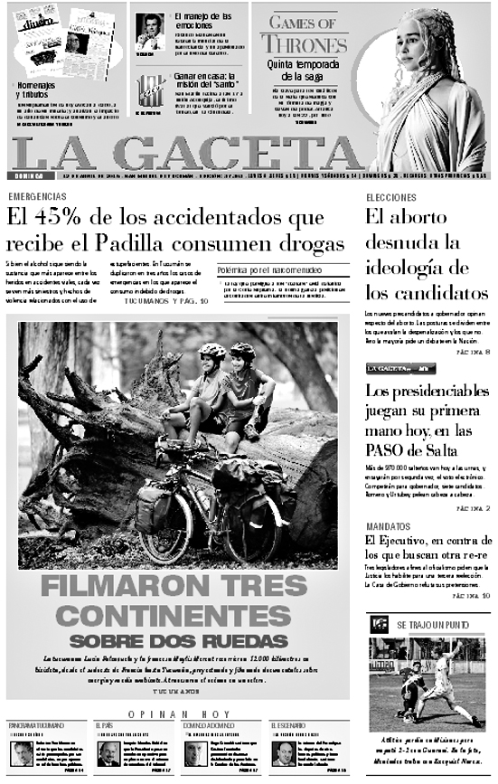 El 45% de los accidentados que ingresan al hospital Padilla consumieron drogas ilícitas. Nos pareció un informe contundente que se merecía llegar a la tapa del diario, porque todos los controles viales apuntan al alcohol, pero no a otras sustancias. La imagen principal corresponde a una historia increíble protagonizada por dos chicas que recorrieron 12.000 kilómetros en bici y en velero para fomentar el uso de la energía sustentable. En tercer lugar, los pales candidatos expresaron sus posturas respecto de un controvertido y polémico tema como el aborto, más vigente que nunca en la agenda política actual.