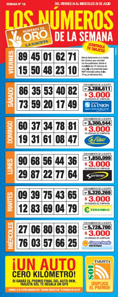 Como cada miércoles, se publicó la grilla completa de los Números de Oro de LA GACETA para que los lectores puedan revisar sus tarjetas. Aquellos que completen los 15 números de una de las grillas de su cartón de Números de Oro deberán presentarse en calle Mendoza 654 hasta las 18, que cierra la semana número 16 de Números de Oro. En caso de que el ganador sea usuario Tarjeta Sol, duplica el premio.
