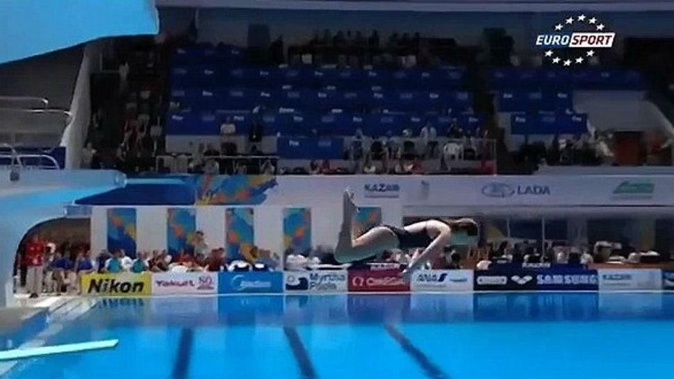 Keeney participaba en saltos ornamentales, era cuarta y buscaba subir posiciones para conseguir un lugar en la final. Le tocaba hacer un salto con dificultad 3,2. Nada fácil. Se preparó y allá fue. Falló en el salto y terminó tirándose de cabeza como si estuviera en club de su barrio.