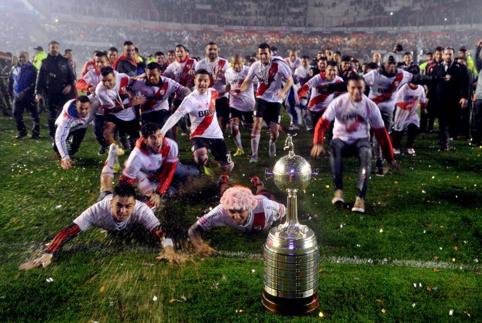 LA COPA SE MIRA Y SÍ SE TOCA... Los futbolistas del “millonario” festejaron la conquista de la Libertadores arrojándose sobre el césped mojado del estadio Monumental de Núñez, que estuvo colmado. télam