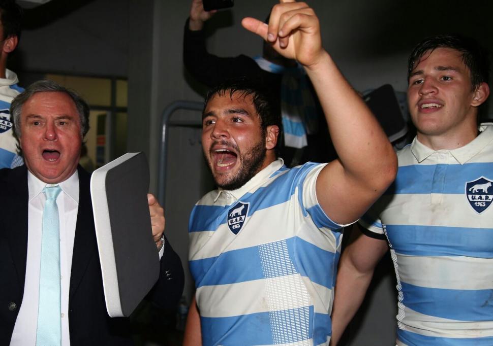 SANGRE NUEVA. El vestuario argentino fue una fiesta, y Lucas celebró junto a otros ex Pumitas, como Matera y Lavanini. foto de lucas noguera paz