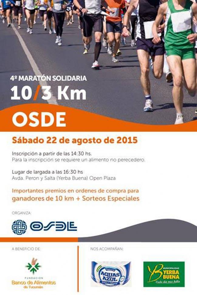 Prepará tus zapatillas, porque tenés una cita con el deporte y la solidaridad. Este sábado se desarrollará la 4ta edición de la Maratón OSDE, a total beneficio del Banco de Alimentos. Será a las 16.30 en el Open Plaza, en Yerba Buena.