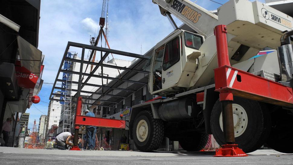 La esquina de Maipú y Mendoza, en pleno microcentro, se encuentra cortada. Allí está trabajando una enorme grúa con la que se está colocando una pérgola.